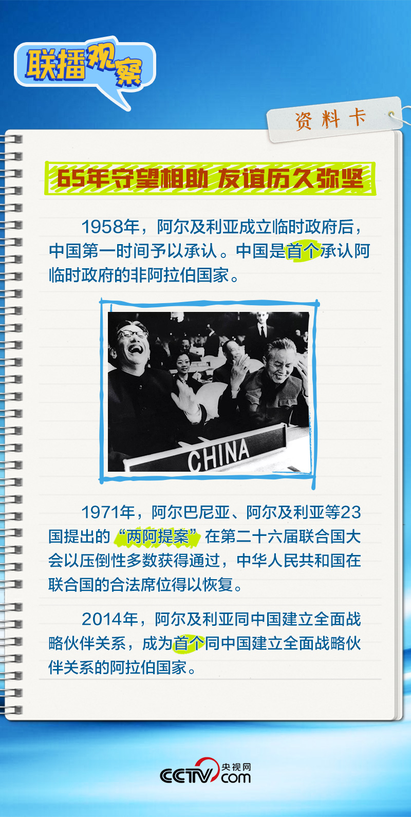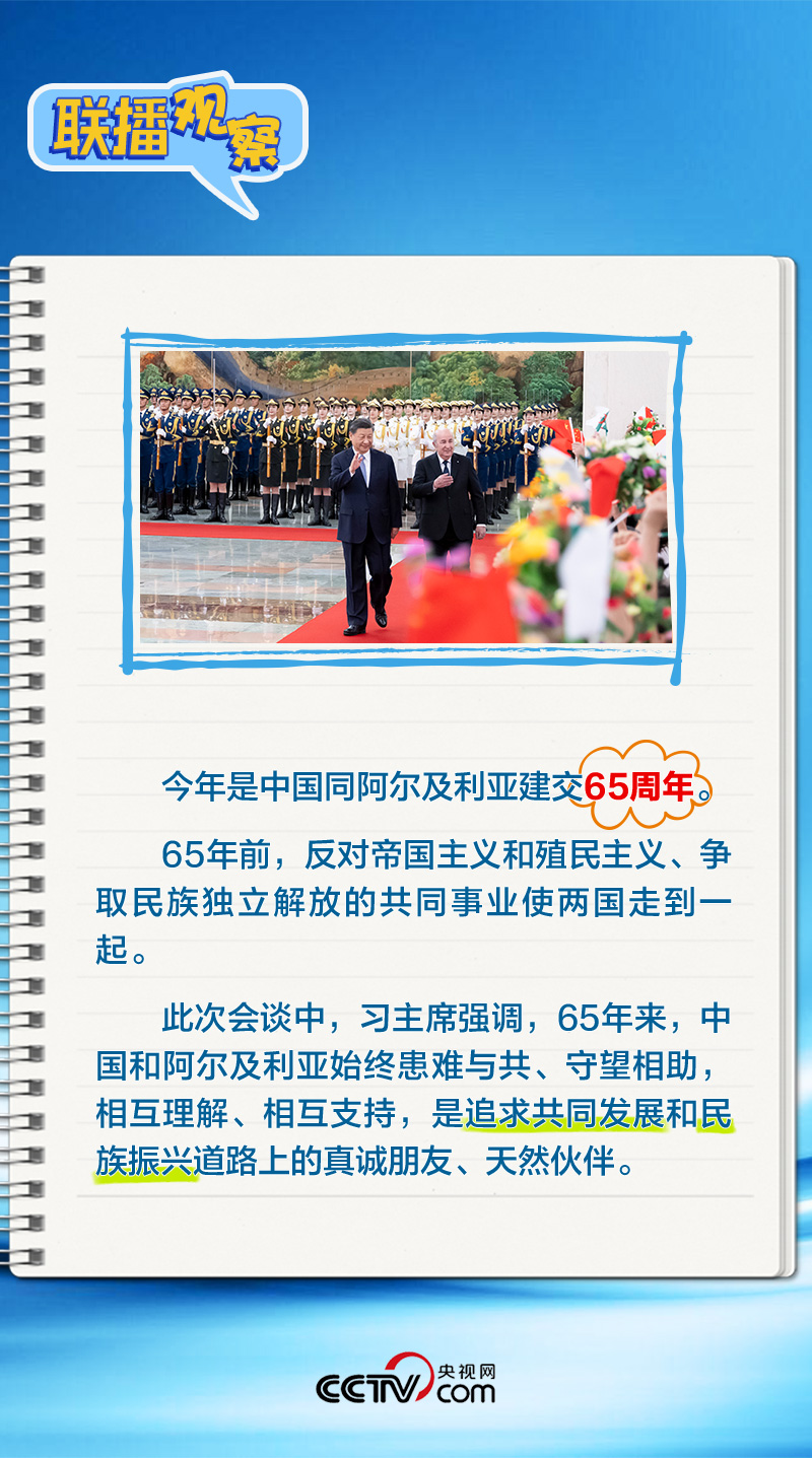 会谈中,习主席特别提到,今年是中国向阿尔及利亚派遣医疗队60周年,并称赞此举树立了“中阿友谊的丰碑”。中阿传统友谊深厚,两国始终相互尊重、平等相待、彼此支持,缔造了一段段友好交往的佳话。