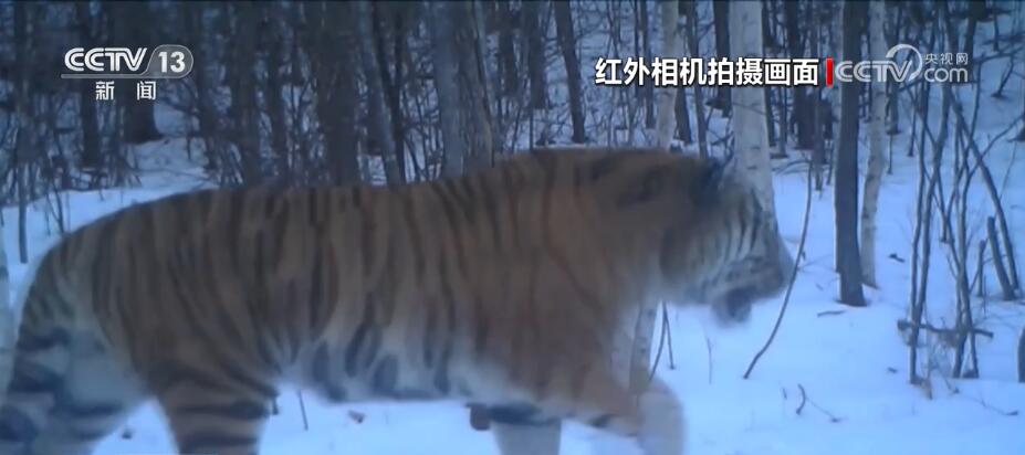国家林业和草原局猫科动物研究中心科研助理 赵越:当时我们放归的时候,它是一只亚成年的东北虎,到现在它的体型变得更加大,而且也壮硕了很多。除了东北虎以外,还有东北豹的相关活动(视频)。我们通过花纹比对和出现的信息,我们判断不止一只东北豹在这个地区活动。