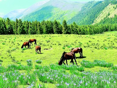 在天祝藏族自治县,位于祁连山东端的冰沟河森林公园郁郁葱葱、空气清新,牛羊马匹如珍珠般散落草原。