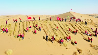 ——在凉州,王天昌、王银吉父子义务治沙20年造林9000多亩,用双手织出一道南北长3.8公里、东西长4公里的防风固沙林带,在腾格里沙漠南缘筑起一道“绿色长城”。每年春秋两季,凉州区6600多名机关干部挺进沙漠义务压沙,播下绿色的种子。