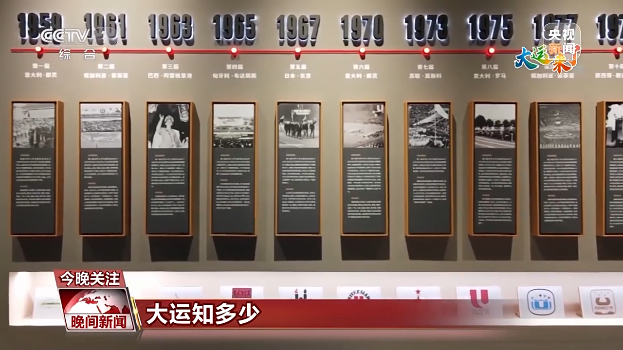 总台记者 蒋林:博物馆里还有一面记录大运会历史的展示墙,上面是从1959年第一届大运会到第30届大运会,每一届比赛都选择了一张经典的大运会开幕式照片,下方还有那次大运会的会徽。
