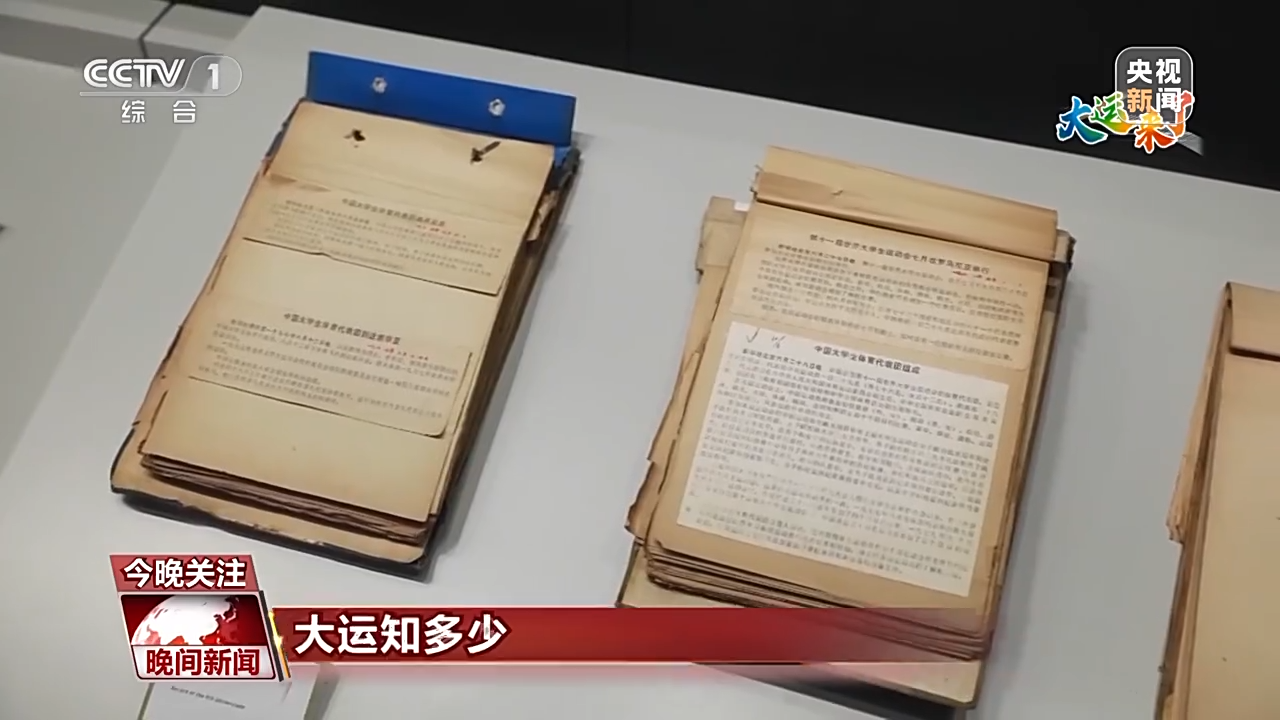 总台记者 蒋林:1975年,中华人民共和国正式加入国际大学生体育联合会,1977年派出了首支代表队参加了第九届在保加利亚索菲亚举行的大运会。在展柜中,我们可以看到许多已经泛黄的体育新闻的剪报册,其中有一册就是1977年第九届索菲亚大运会时候的新闻,有一条上面写着:中国大学生体育代表团到达索菲亚,时间是1977年8月14日。
