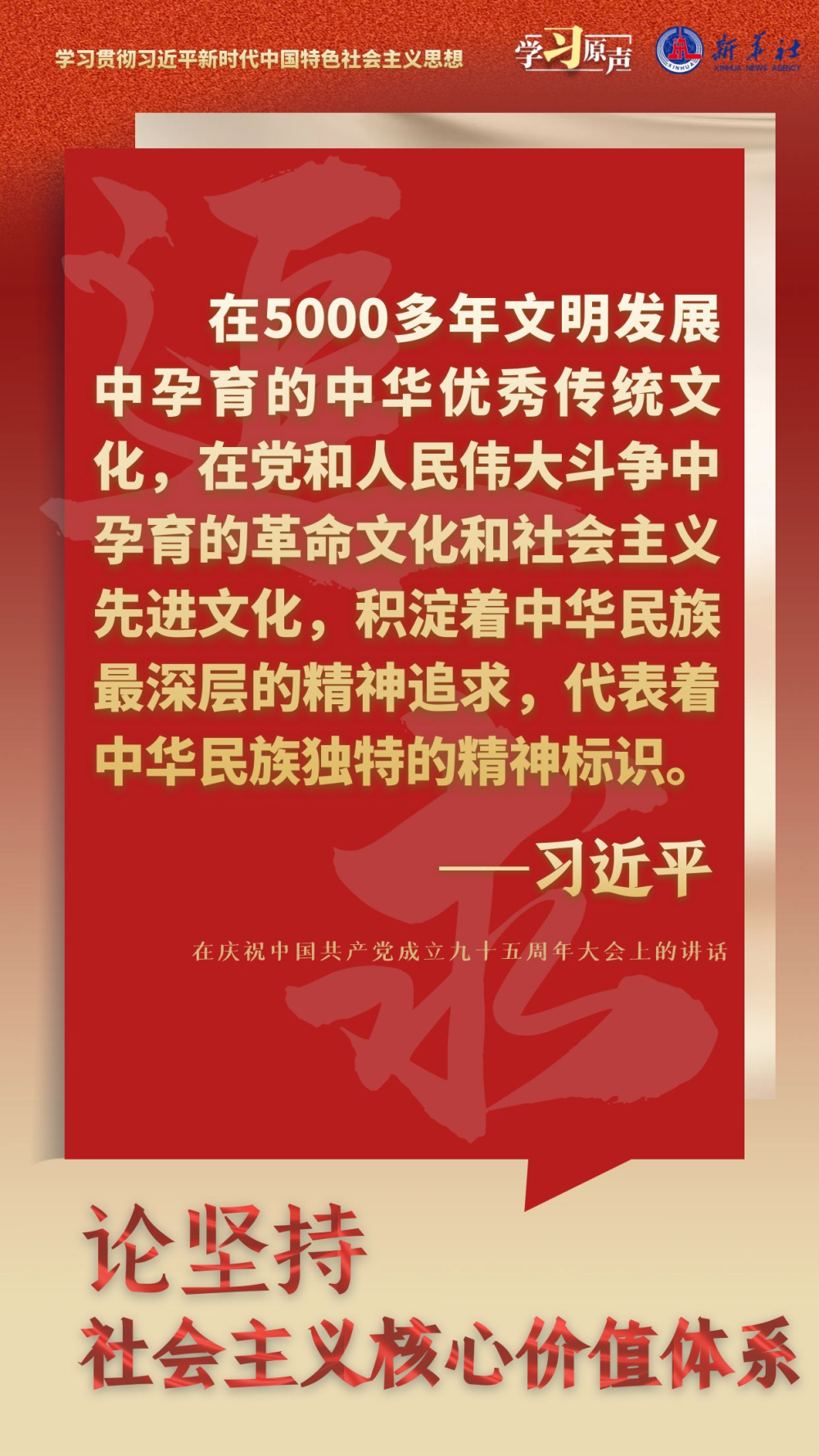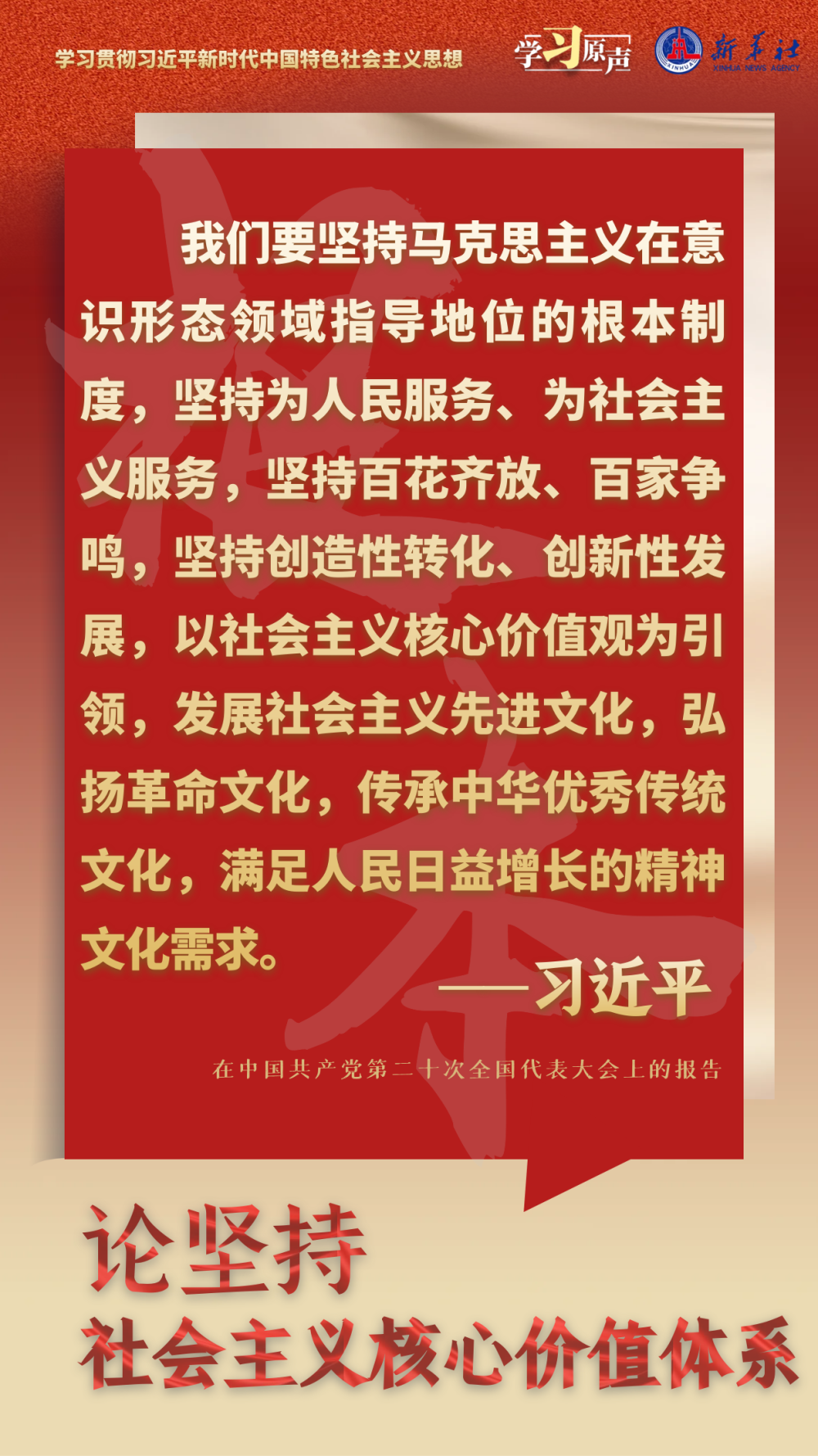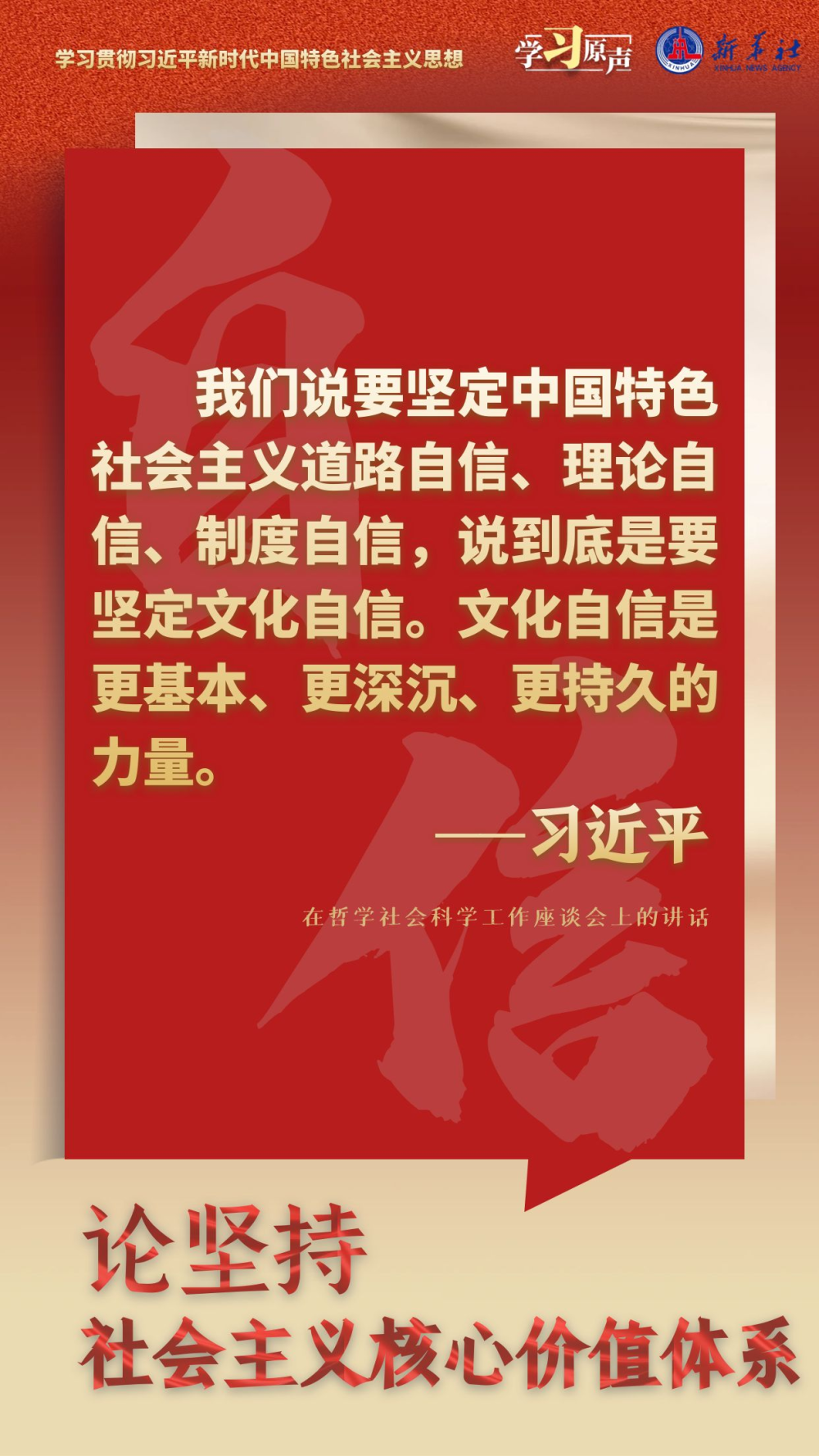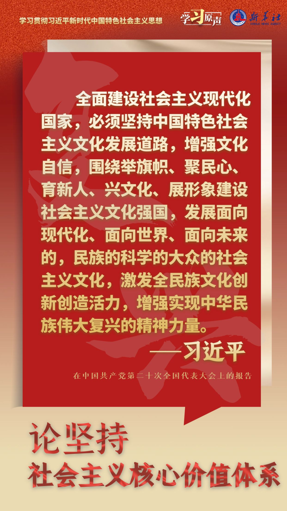 习近平总书记强调,在新的历史起点上继续推动文化繁荣、建设文化强国、建设中华民族现代文明,要坚定文化自信,坚持走自己的路,立足中华民族伟大历史实践和当代实践,用中国道理总结好中国经验,把中国经验提升为中国理论,实现精神上的独立自主。要秉持开放包容,坚持马克思主义中国化时代化,传承发展中华优秀传统文化,促进外来文化本土化,不断培育和创造新时代中国特色社会主义文化。要坚持守正创新,以守正创新的正气和锐气,赓续历史文脉、谱写当代华章。