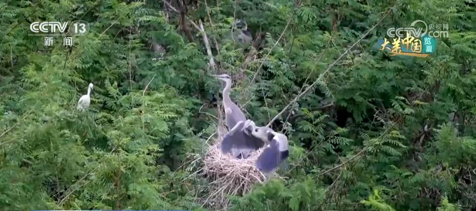近段时间,河北省秦皇岛市的桃林口水库的库区内碧水盈盈,河畔的林木葳蕤(wēi ru),郁郁葱葱,一派自然和谐的美景。从高处俯瞰,苍翠之间可以看到星星点点的白色,那便是国家二级保护动物苍鹭。苍鹭或三两为伴嬉戏玩耍,或独自伫立枝头眺望远方。水面上,还有苍鹭展翅滑翔觅食育雏,数量多时,这里的苍鹭可达上千只。除了苍鹭外,还有黑鹳、鸬鹚、白鹭等各种鸟儿在此栖息安家。