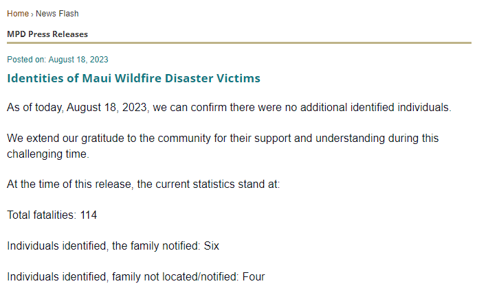 美国夏威夷州毛伊岛8月8日燃起大火。根据毛伊县政府的通报,截至当地时间18日,大火导致的死亡人数已上升至114人。