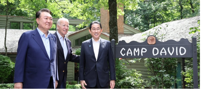 当地时间18日上午,美国总统拜登在戴维营迎接日本首相岸田文雄、韩国总统尹锡悦到访 图源:韩联社