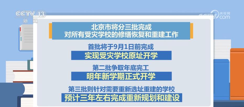 据了解,北京市将分三批完成对所有受灾学校的修缮恢复和重建工作。其中,首批将于9月1日前完成,实现受灾学校原址开学。第二批争取年底完工,明年新学期正式开学。第三批则针对需要重新选址重建的学校,预计三年左右完成重新规划和建设。