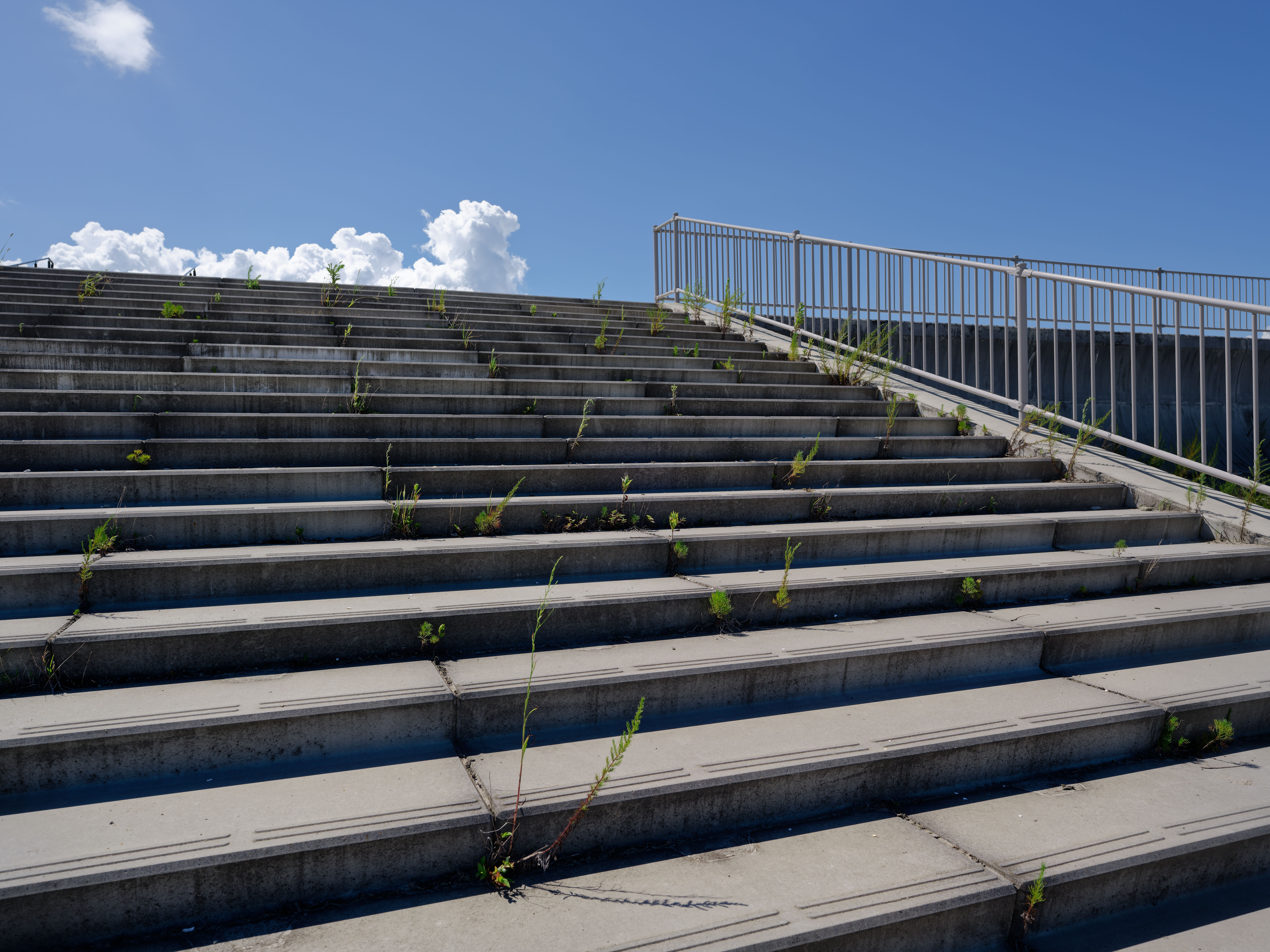 ↑8月22日,日本福岛县相马郡新地町钓师浜海水浴场的台阶上杂草密布。新华社记者张笑宇摄