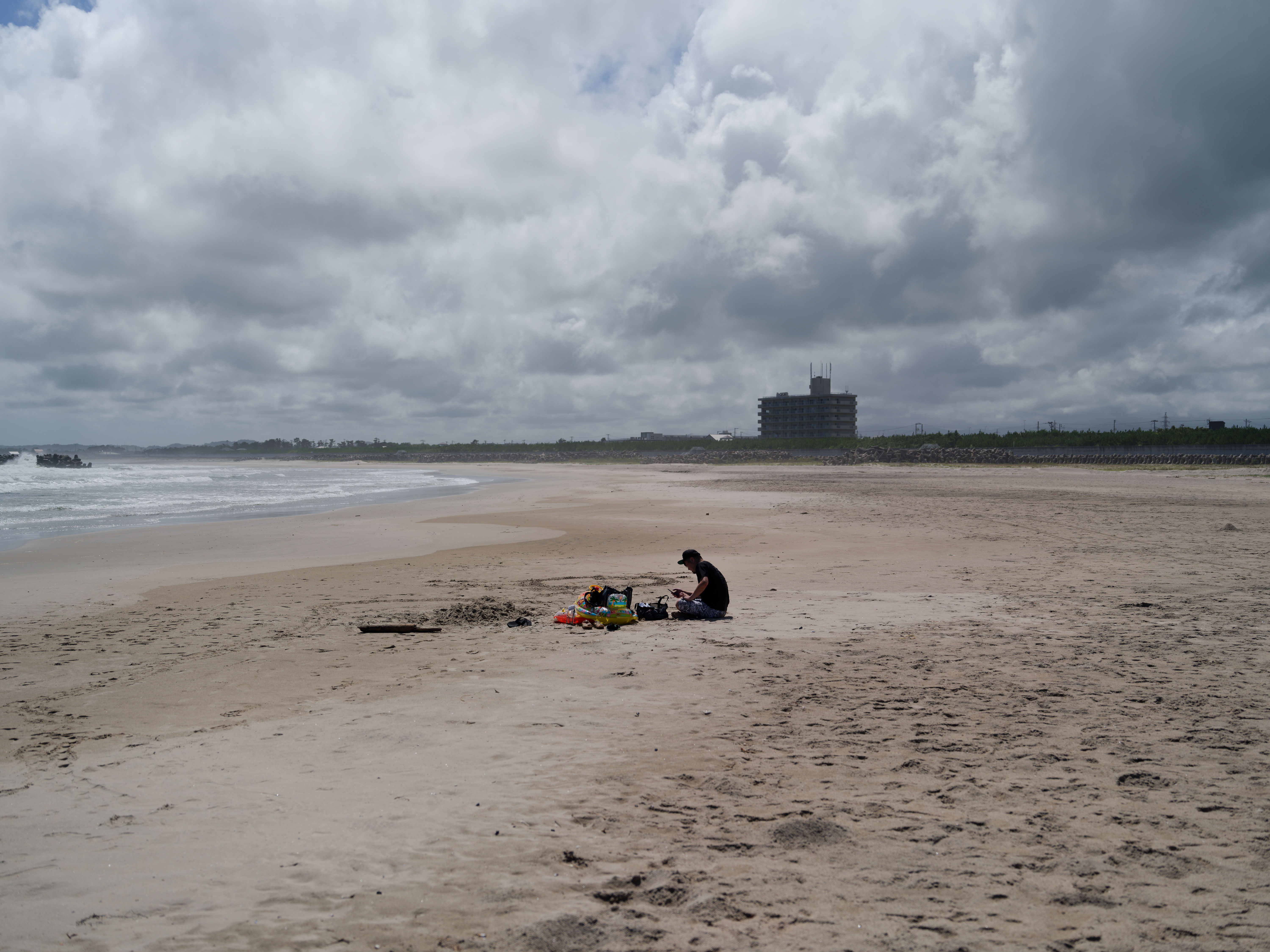↑8月23日,一位游客坐在日本福岛县磐城市四仓町的四仓海水浴场。新华社记者张笑宇摄