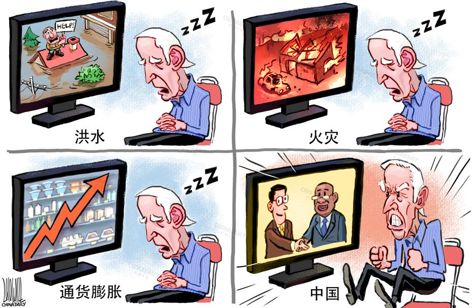 “瞌睡乔”内政无力,只有在干涉中国时才会清醒。(来源:中国日报 罗杰 英文《中国日报》2023年8月25日8版)
