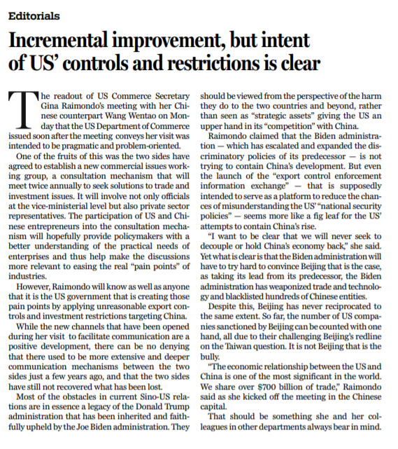 然而,这些“痛点”到底是源自于谁,想必雷蒙多和其他人一样心知肚明——它们正是由美国政府对华实施的各种不合理出口管制、投资限制所造成。当前中美双边关系中绝大部分的障碍,本质上是特朗普执政时期的“遗产”。因其对两国及更广泛层面造成的损害,这些政策应被重新审视,而不是被当成所谓的“战略性资产”。但拜登政府不但延续了其前任对华的歧视性政策,还将之进一步“拓展升级”——当前,拜登政府已经把贸易和科技“武器化”,把数百家中国实体列入了“黑名单”,这与其前任相比可谓有过之而无不及。即便本次双方启动了出口管制信息交流机制,该机制被视作减少对美国“国家安全政策”解读误判的沟通平台,但这种做法,似乎还是像美国在给自己试图遏制中国崛起的行为“打掩护”。