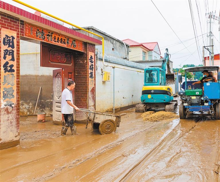 ▼8月7日,河北省涿州市东仙坡镇网户庄村,村民清理街道淤泥,恢复生产生活。