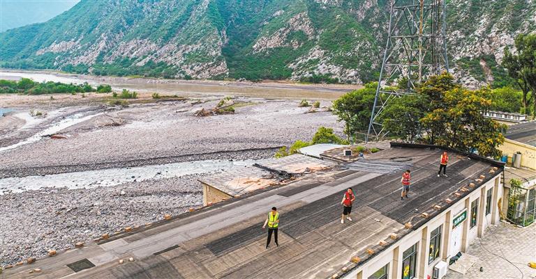 ▼8月5日,中国移动北京公司抢修人员在北京市门头沟区王平镇铺设光缆,恢复受灾地区通信网络信号。张武军摄(中经视觉)