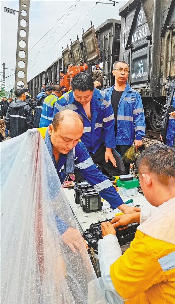 ▶8月6日,黑龙江省哈尔滨市尚志地区出现强降雨,哈尔滨通信段通信工紧急赶赴现场,开展铁路通信光缆割接抢修工作。娄明珠摄(中经视觉)
