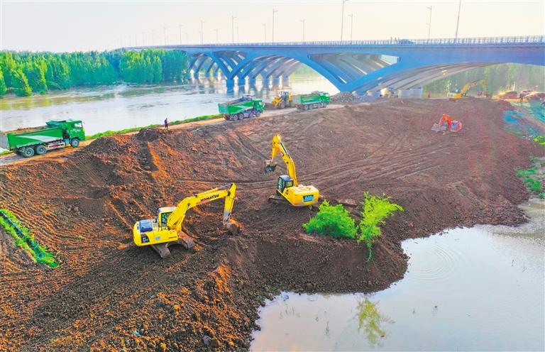 ▲8月6日,工人操作机械在河北省白沟新城高桥村白沟河左堤进行除险加固作业。