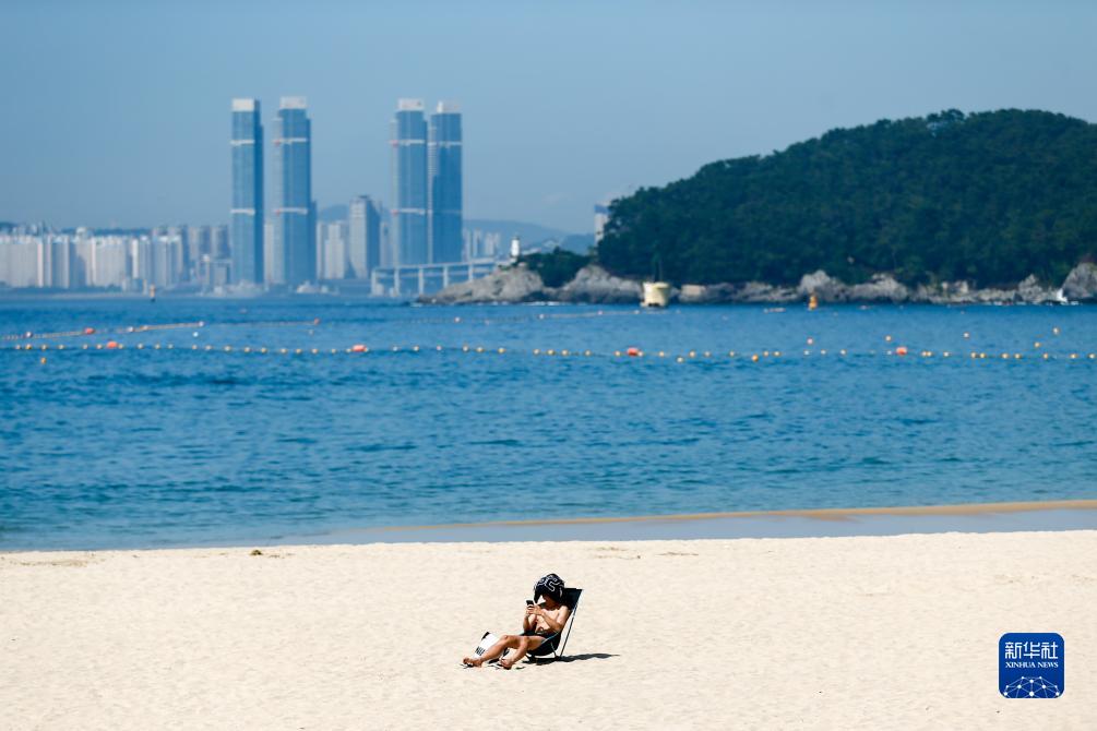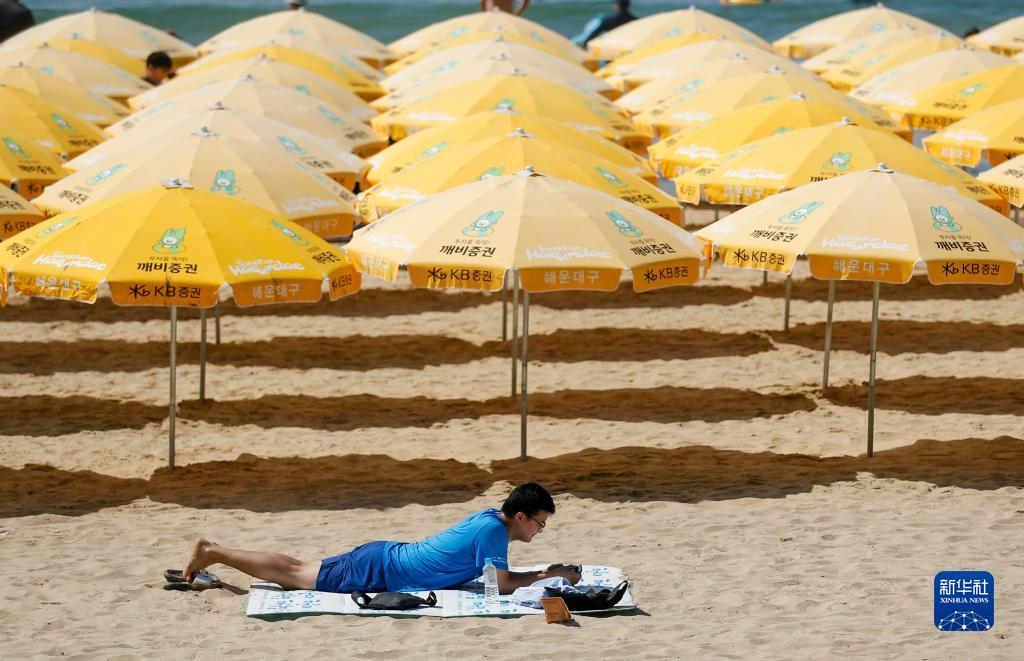 8月3日,市民在韩国釜山的沙滩晒日光浴。