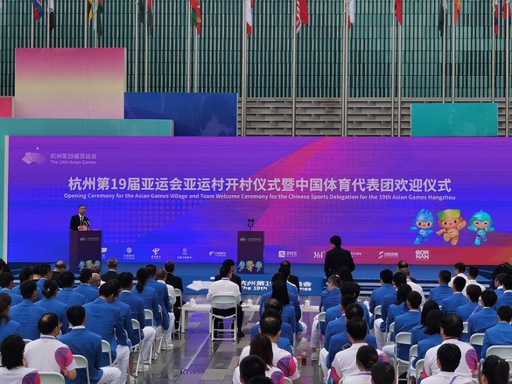 中国青年报客户端杭州9月16日电(中青报·中青网记者慈鑫文并摄)今天上午,杭州亚运村举行开村仪式暨中国体育代表团欢迎仪式。中国代表团为首支入住亚运村的队伍,这也标志着亚运村正式投入赛时运行。 开村仪式上,杭州市市长、杭州亚组委副主席兼秘书长姚高员、亚奥理事会代理总干事维诺德分别致辞。姚高员表示,亚运村将全心全意为大家提供舒心的居住服务,全力以赴为大家提供安心的备赛保障,全情投入为大家提供丰富的文化体验。维诺德赞扬杭州亚运村的理念极具创新性,充分彰显了亚洲奥林匹克运动的团结一致。 据介绍,杭州亚运村由运动员村、技术官员村、媒体村组成。亚运会举办期间,亚运村将为2万余名运动员、随队官员、技术官员和媒体人员提供住宿、餐饮、交通、文化、科技、医疗、商业等全方位服务保障。当天,除杭州亚运村正式开村外,宁波、温州、金华、桐庐、淳安5个分村和绍兴、临安、萧山3个运动员接待饭店同时开村,迎接各代表团入住。