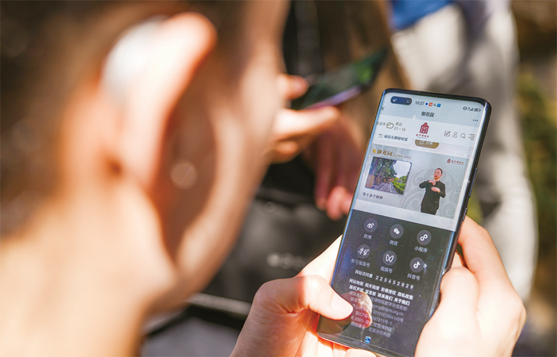 2023年5月18日,故宫博物院、北京手语研究会联合举办“听见文化的声音——故宫博物院手语无障碍服务发布会”,这是北京首批手语导览服务正式上线发布。图为一名听障人士在观看手语讲解视频。 新华社记者 彭子洋/摄
