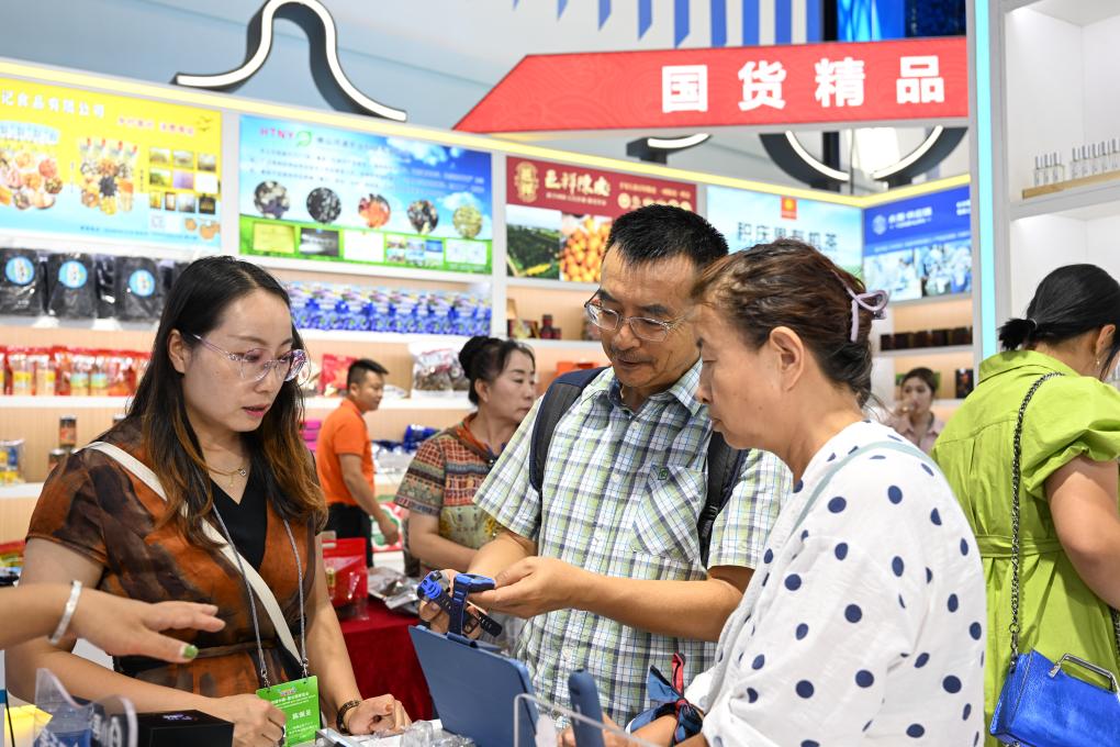 9月6日,游客(中)在第四届中国—蒙古国博览会上选购商品。新华社记者 贝赫 摄
