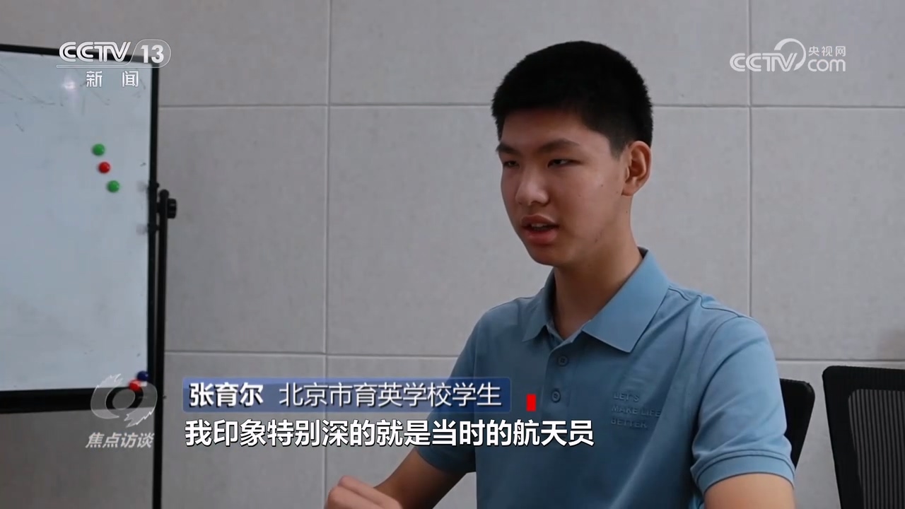 北京市育英学校学生张育尔:“我印象特别深的是当时航天员拿针筒把气泡注射到水里,然后形成了一个类似于放大镜的视觉效果,看到这个感觉很新鲜、很科幻,一开始是好奇心驱动了,后来就开始了解这方面的东西。”