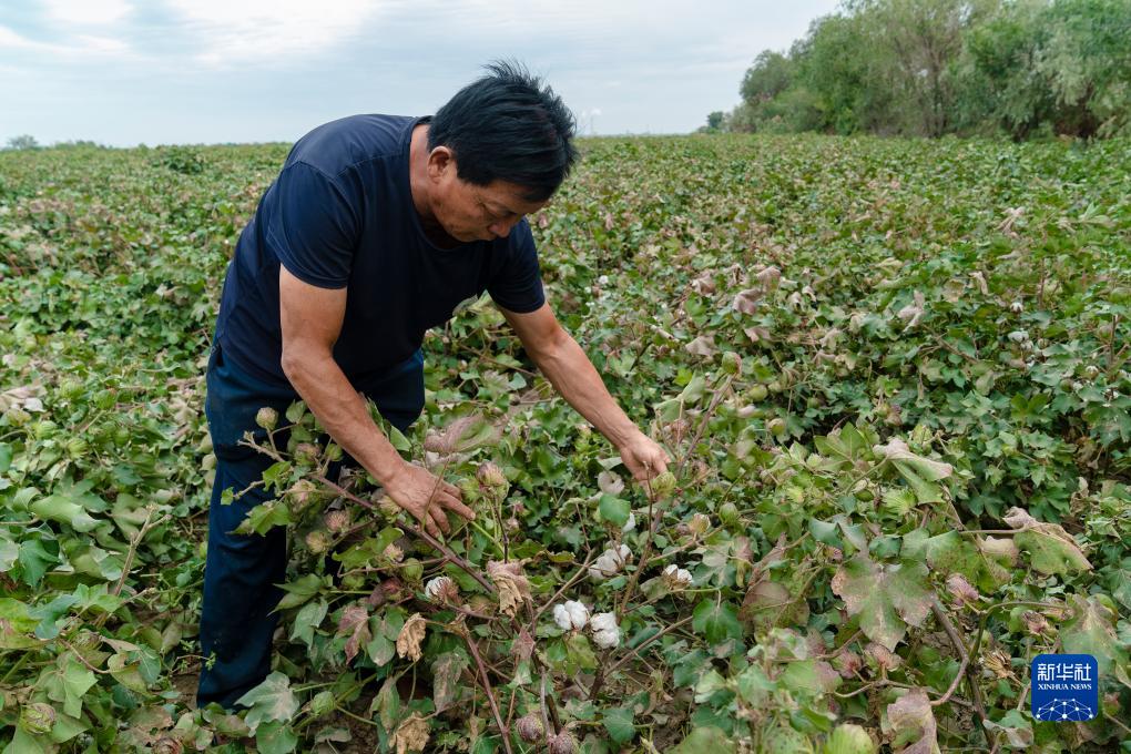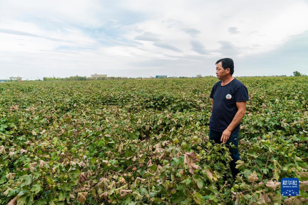 9月14日,在新疆乌鲁木齐附近五家渠市的一片棉田,棉农巩伦全查看棉花长势。新华社记者 周生斌 摄