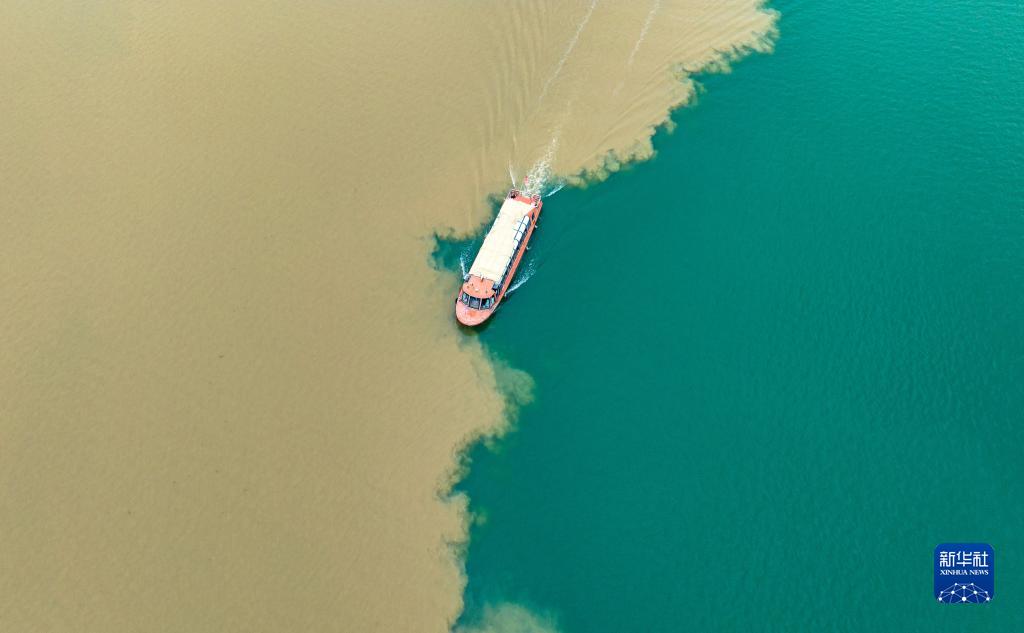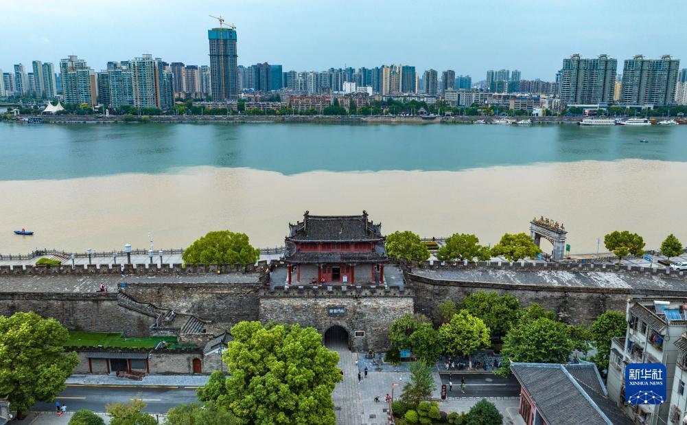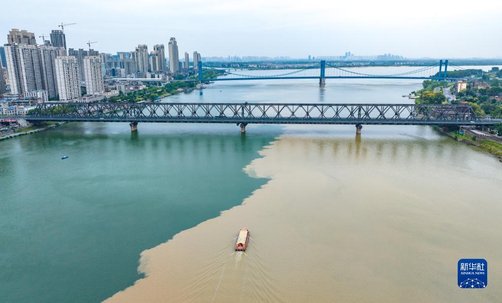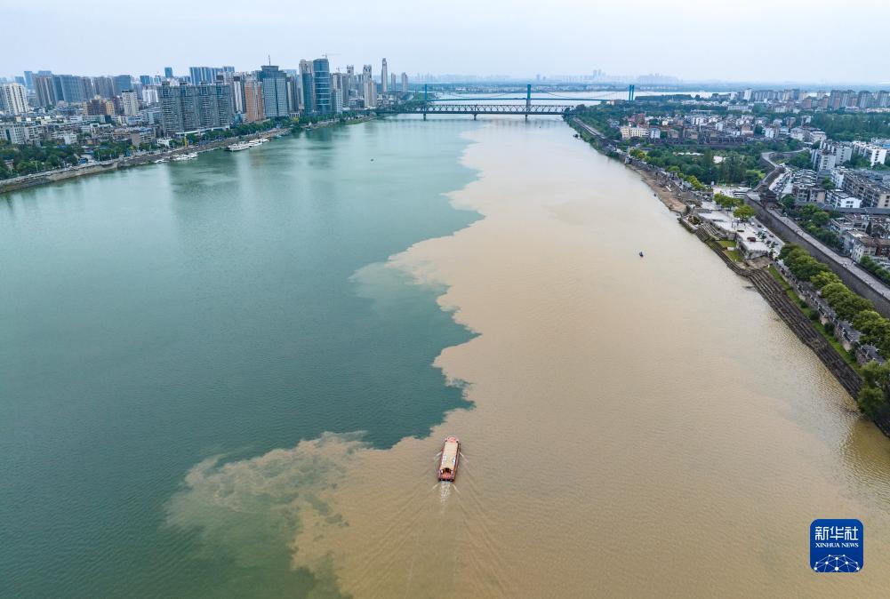 9月20日,受降雨影响,汉江湖北襄阳城区段呈现出“泾渭分明”的景观(无人机照片)。新华社发(杨东 摄)