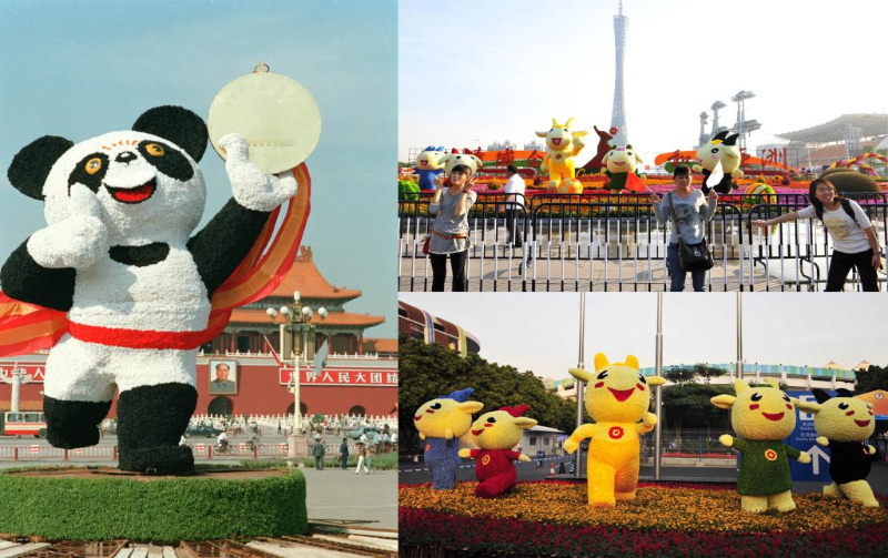左图:第11届亚运会吉祥物熊猫“盼盼”的造型;右上图:人们在第16届亚运会吉祥物“祥和如意乐洋洋”雕塑前拍照;右下图:广州亚运会吉祥物造型花卉。资料照片