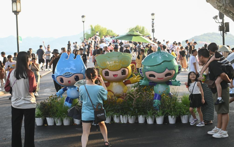 游客在位于杭州西湖景区的断桥边与杭州亚运会吉祥物合影。新华社记者 黄宗治 摄