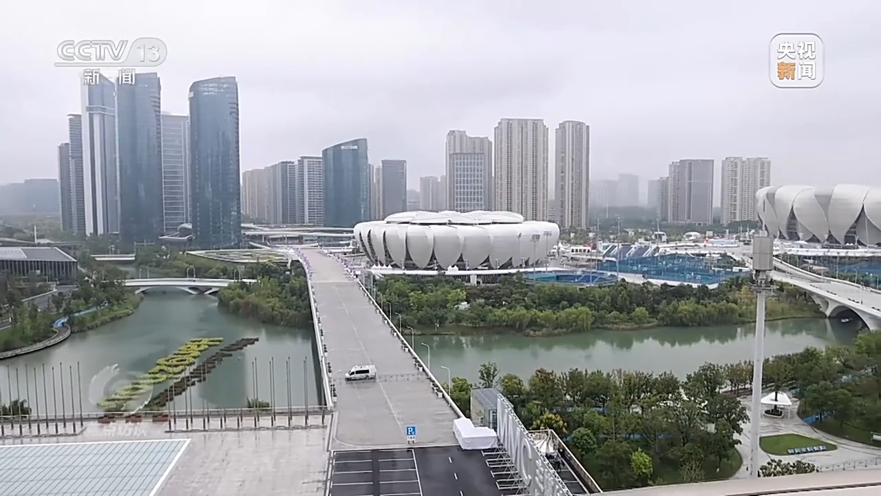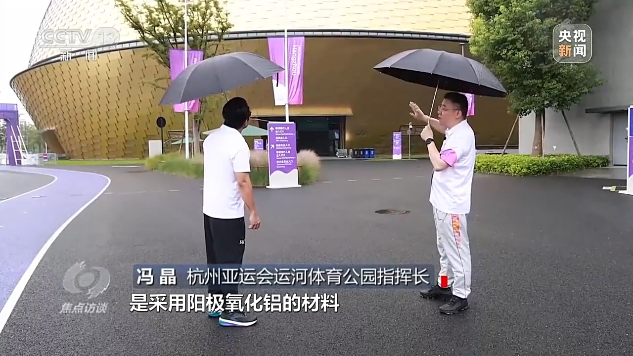 杭州亚运会运河体育公园指挥长 冯晶:亚运体育公园是按照绿色环保功能打造的,也是浙江省首座体育场馆绿色三星级建筑。体育馆的外立面采用阳极氧化铝材料,在雨天有自清洁的功能,不用人工清洗外立面。透水混凝土在雨天有非常好的渗水功能,和我们的人工湖相结合,在晴天可以反哺草地,实现海绵城市的标准规范。