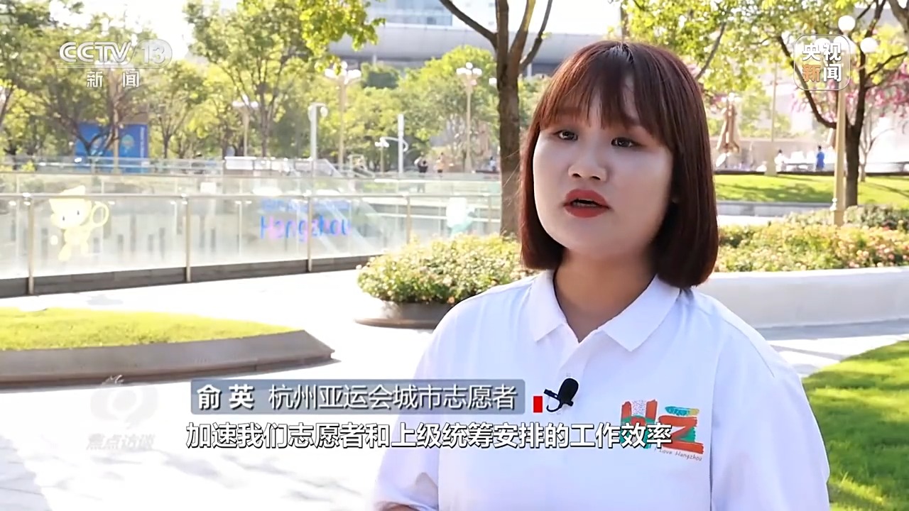 杭州亚运会城市志愿者 俞英:我们在志愿者服务的过程当中,会使用到‘马上报’这样一个APP,加速志愿者和上级统筹安排的工作效率,我们可以通过智能化服务软件尽快解决问题。杭州不仅历史文化非常丰富,同时是一座拥有现代化一面的城市,也希望来到杭州的朋友们,可以尽情享受亚运,可以感受到杭州的与众不同。