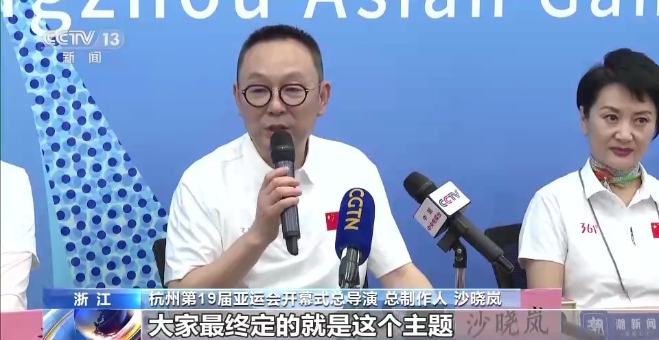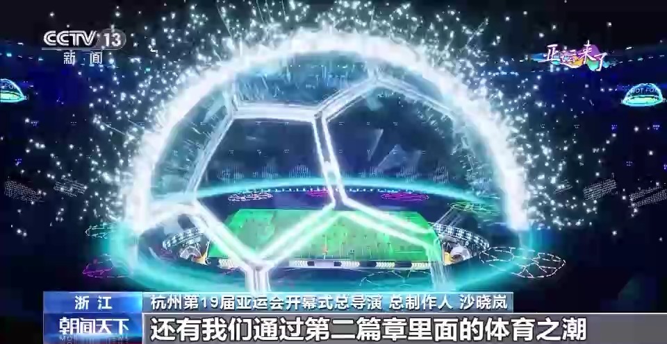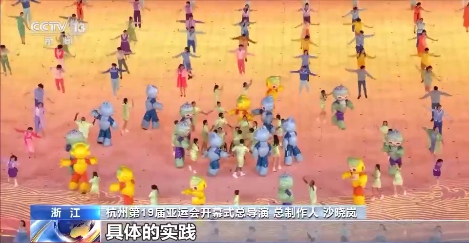 杭州第19届亚运会开幕式总导演 总制作人 沙晓岚:在创作的时候,我们把宋韵文化作为上篇的核心表达,有5000年的良渚,到了近千年的杭州的宋韵,再穿越到当今的现代杭州,大家也可以看到一个通过拱宸桥连接了古今的杭州。还有通过第二篇章里面的体育之潮,把体育元素充分地展现,包括体育运动的标识、运动符号、一些球类的表演,到了下篇叫做人文之潮,绿水青山就是金山银山,幸福的生活,绿水青山在这个当中。