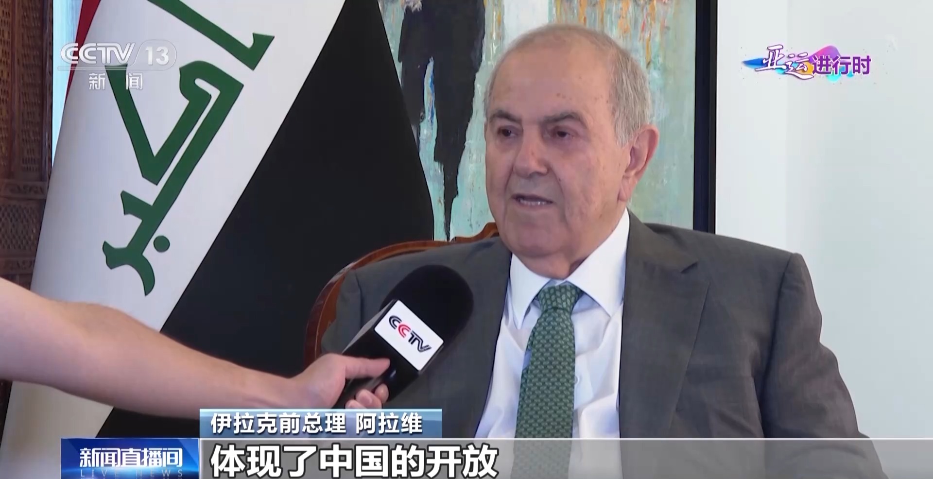 伊拉克前总理 阿拉维:在中国举办的本届亚运会开幕式体现了中国的开放,令人感到欢欣鼓舞,亚运会的举办加强了与伊拉克在内的各国间联系。