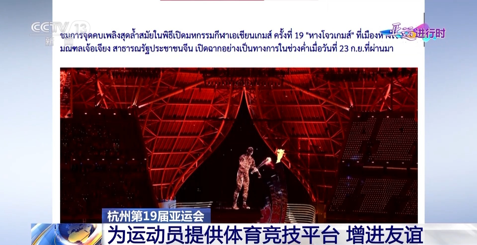 多家泰国媒体报道了杭州亚运会开幕式,并进行了积极评价。泰国泰叻传媒集团网站称,杭州亚运会盛大开幕式不仅传递绿色环保理念,还首次采用“数字火炬手”参与点火仪式,展现了中国领先的科技水平。泰中记者协会官网称,杭州亚运会不仅为亚洲各国运动员提供了一个高水平的体育竞技平台,更促进了亚洲各国间的文化交流、增进亚洲人民之间的友谊。