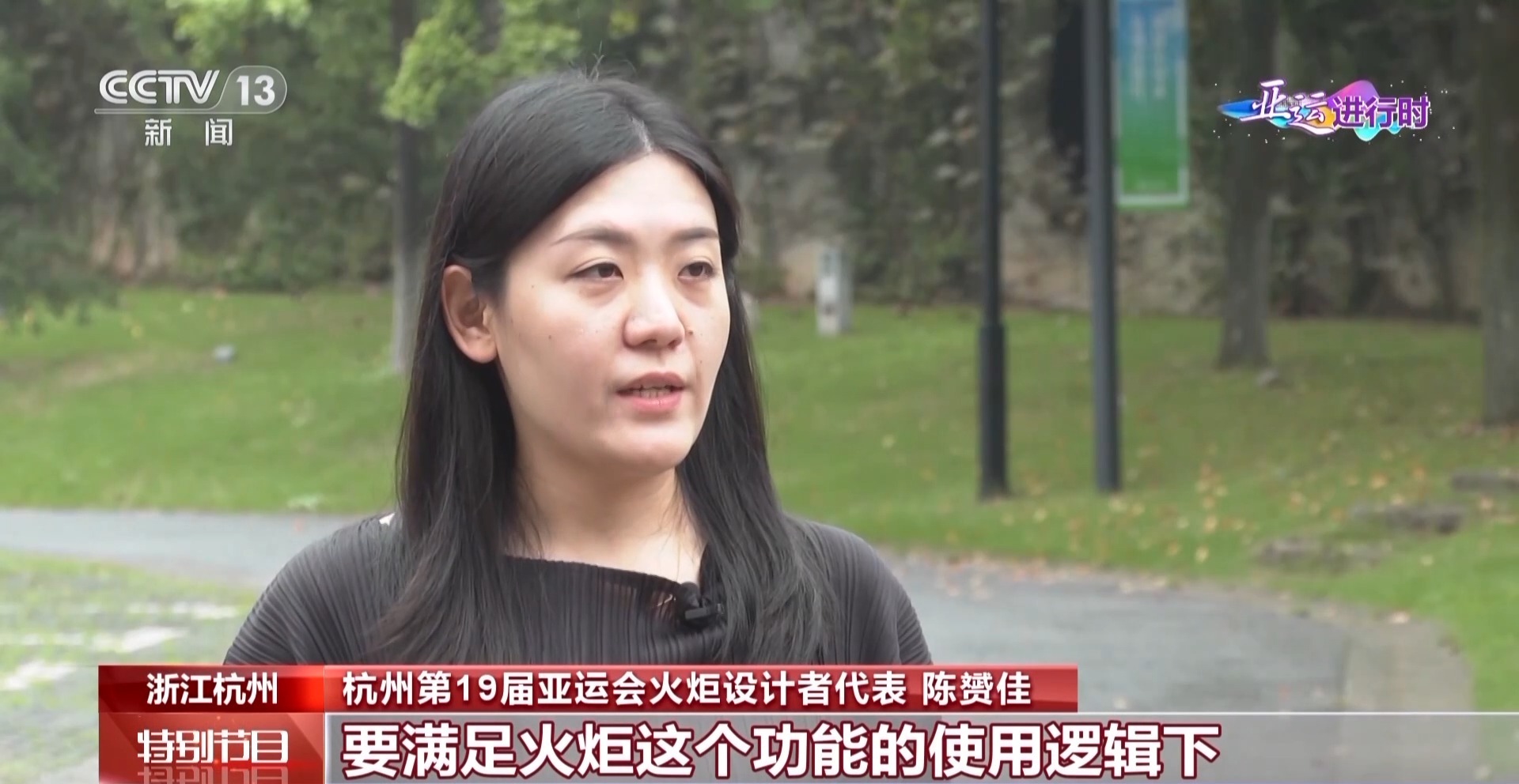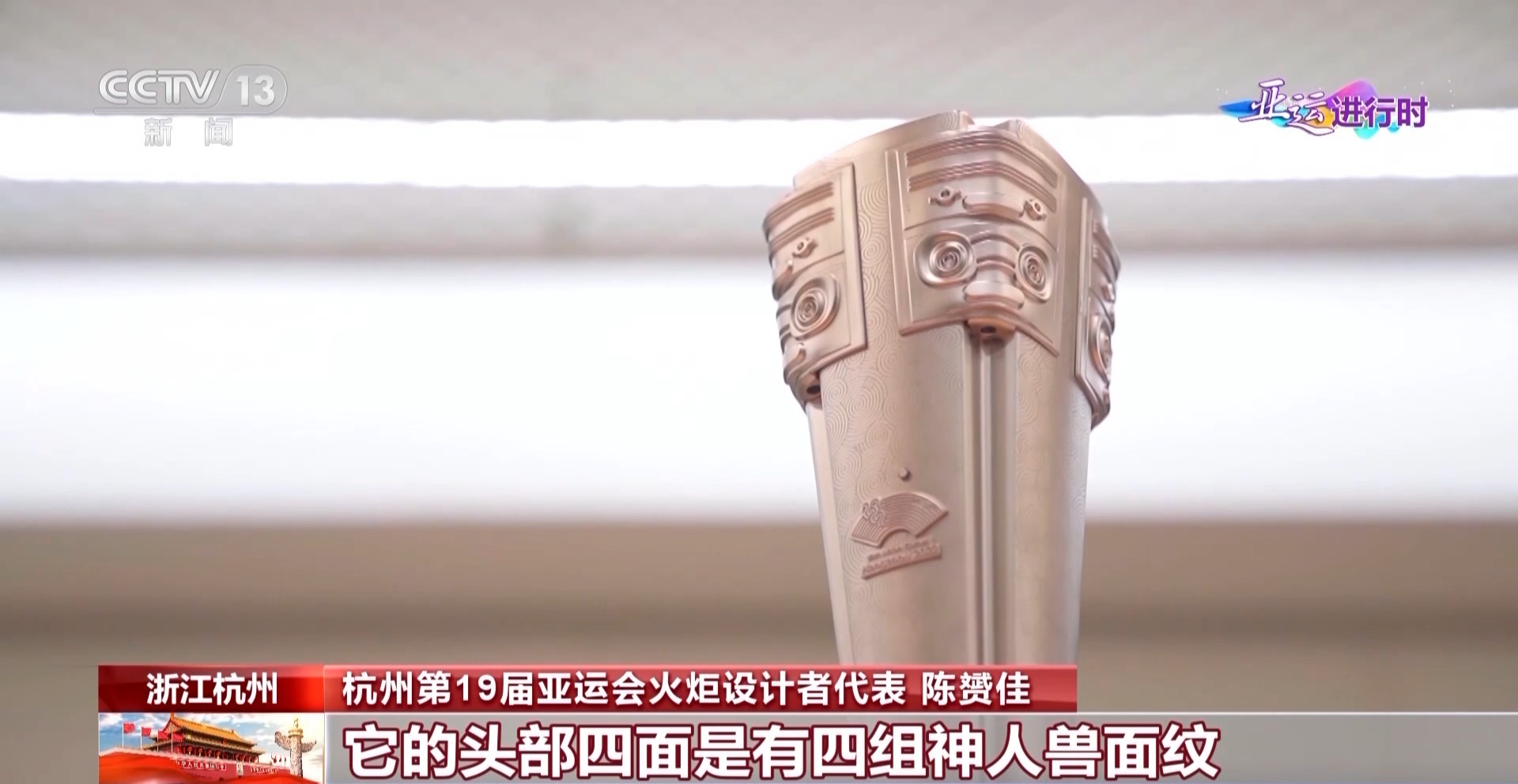 杭州第19届亚运会火炬设计者代表 陈赟佳:要满足火炬这个功能的使用逻辑下,突破了以往火炬的设计范式,借助玉琮这个符号建构了一种独特的上方下圆的新器型,是以器传礼的这种中华式的文化表达。