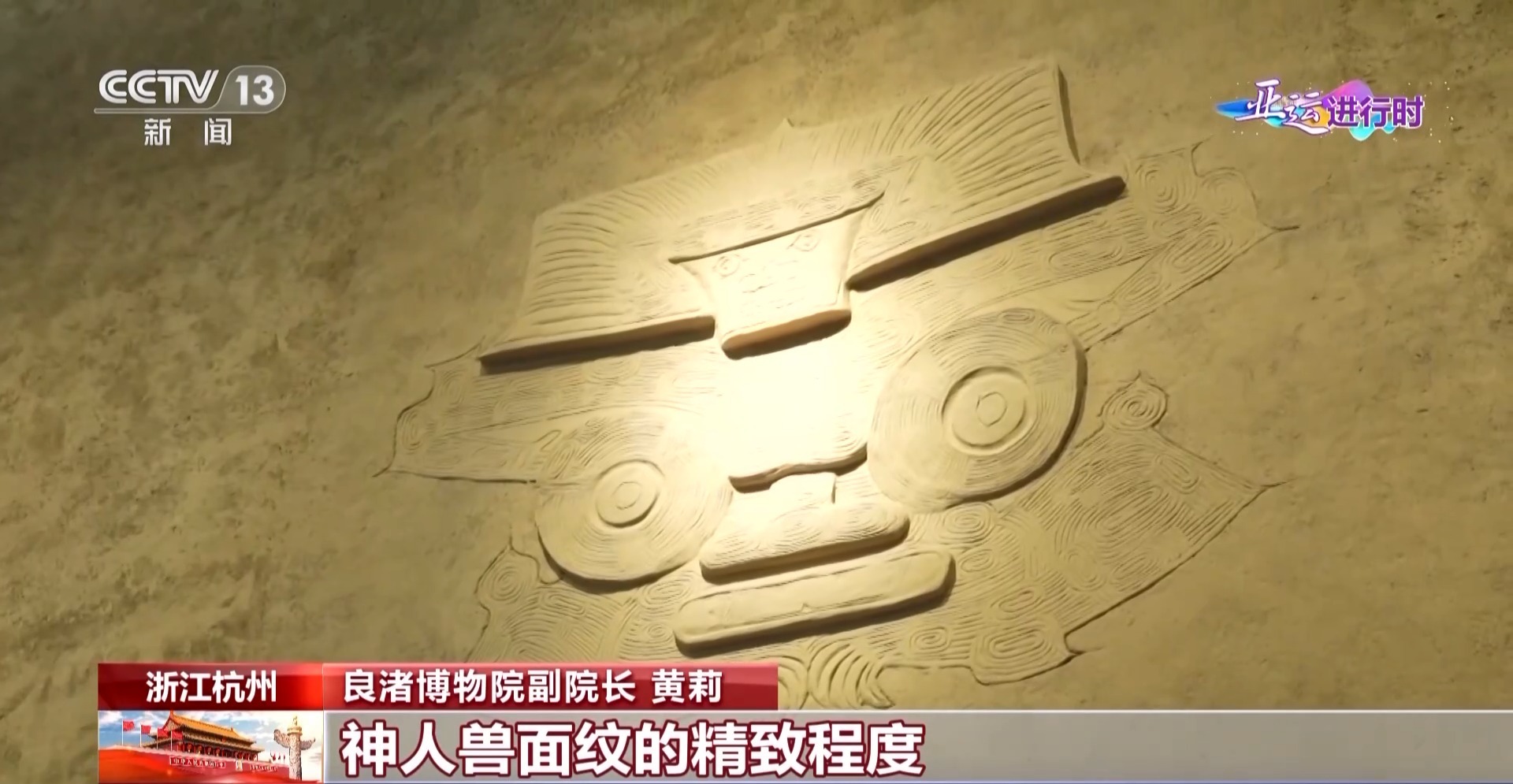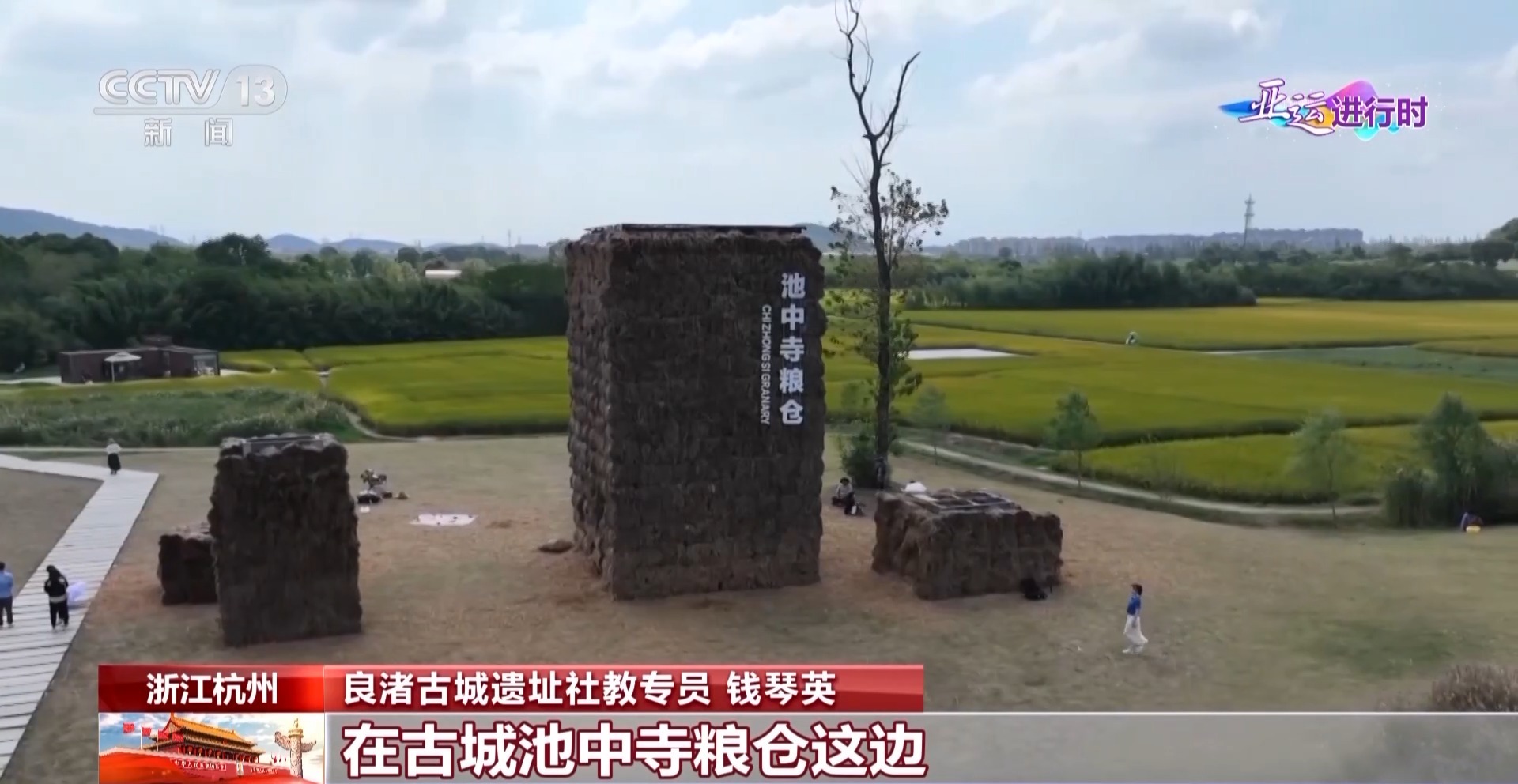 总台记者 张景:进入良渚古城遗址,首先迎接大家的是杭州亚运会的三个吉祥物。在中间的叫琮琮,良渚文物玉琮的琮,这是它名字的来源。头饰的设计灵感也来自玉琮上的神人兽面纹。它身上的颜色像稻子成熟后的金黄色,有一个好听的名字叫“丰收黄”,这个灵感也是来自良渚,因为这里在五千年前就已经开始大规模种植水稻了。