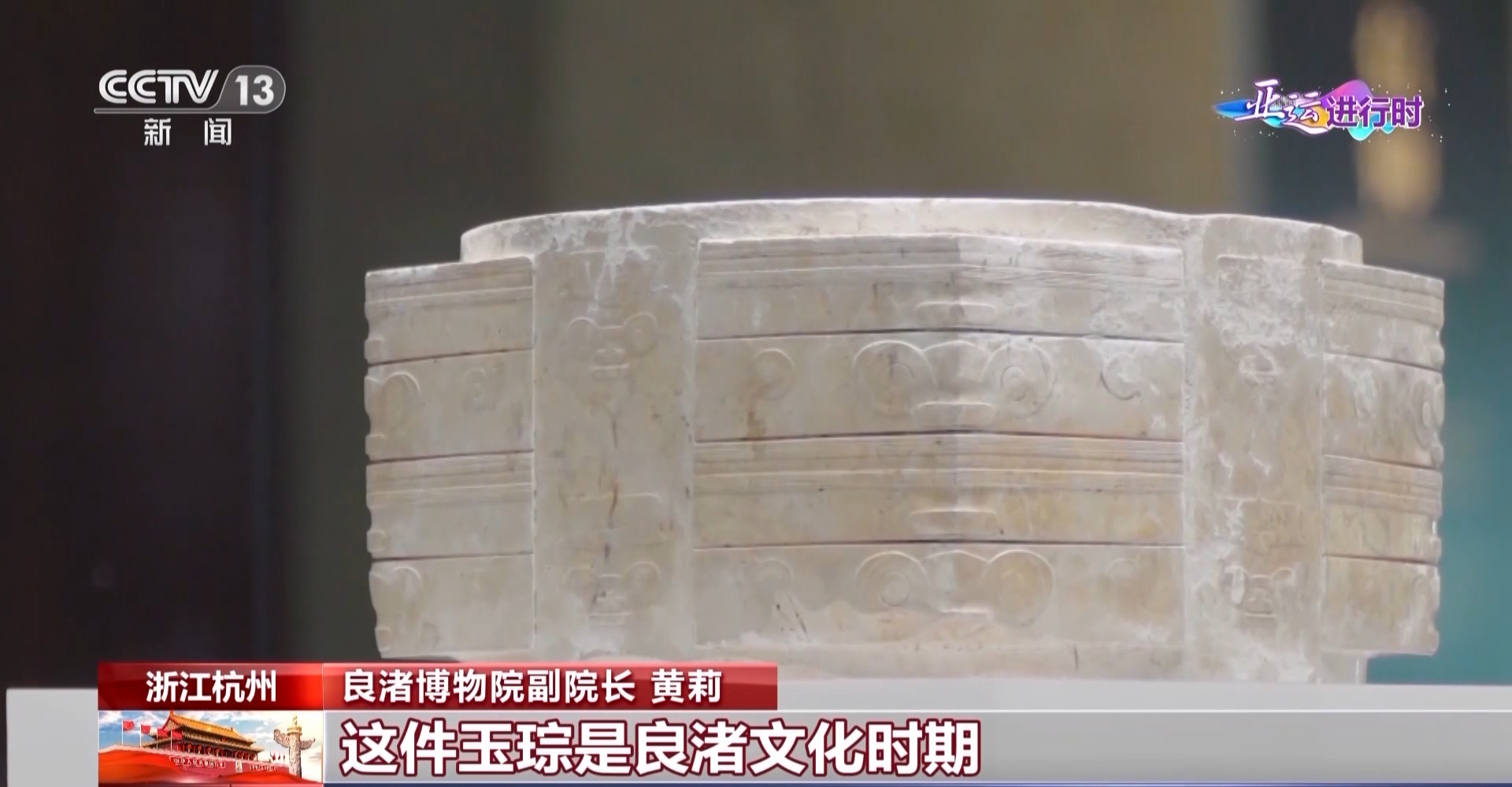 总台记者 张景:我手上拿的是杭州亚运会的火炬,名字叫“薪火”,高0.73米,净重2.4斤。在火炬接力的时候这里面燃烧的是环保燃料,而且八级大风吹不熄,大雨直淋浇不灭,技术含量非常高。除此之外,它所包含的文化元素也非常丰富。看它的出火口,这个头部,跟我手上拿的这个外形和纹饰是不是很像?这是杭州有着五千年历史的良渚文明的标志性文物,叫玉琮,一块玉器。不过我拿的是一个仿制的文创纪念品,我们要走进良渚博物院,跟着这里面的专家,看看这些真正的、有着几千年历史的文物。