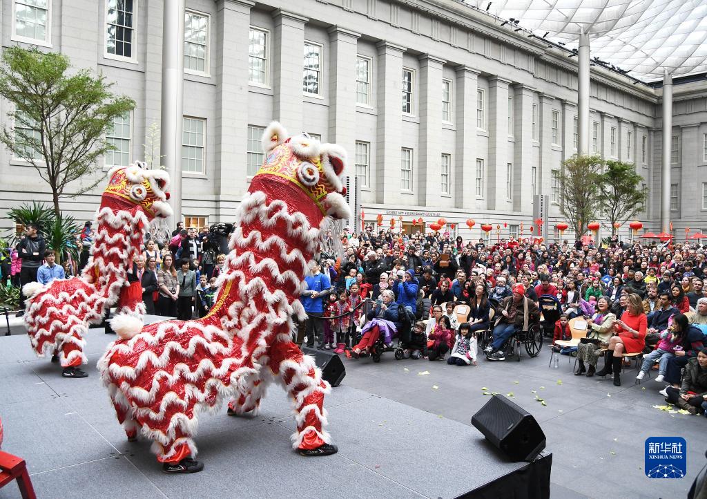 在美国华盛顿的史密森学会美国艺术博物馆,参加“中国新年家庭日”活动的人们观看舞狮表演(2017年1月28日摄)。 新华社记者 殷博古 摄