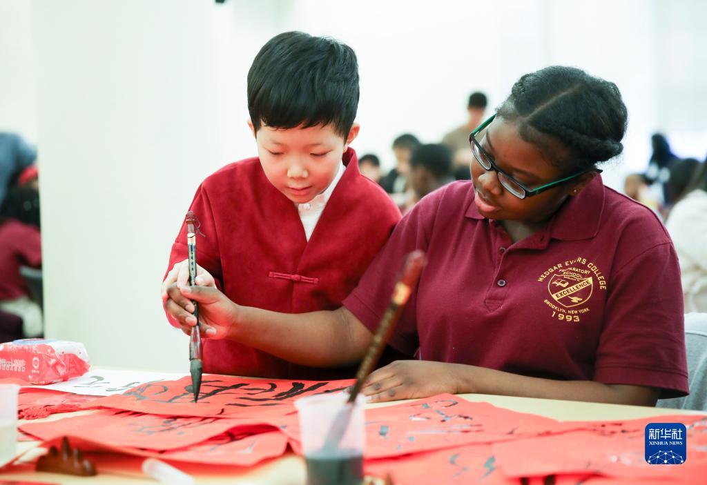 来自北京的小学生教纽约梅德加·埃弗斯学院预备学校的学生中国书法(2018年2月2日摄)。当天,近百名中美中小学生在美国纽约参加文化交流活动。 新华社记者 王迎 摄