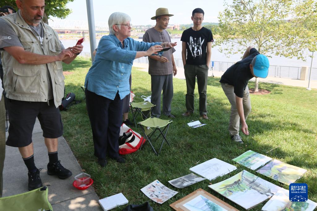 在美国中西部城市辛辛那提,参加柳州与辛辛那提姐妹城市艺术交流项目的中美画家在俄亥俄河畔交流画技(2019年7月25日摄)。 新华社记者 张凤国 摄