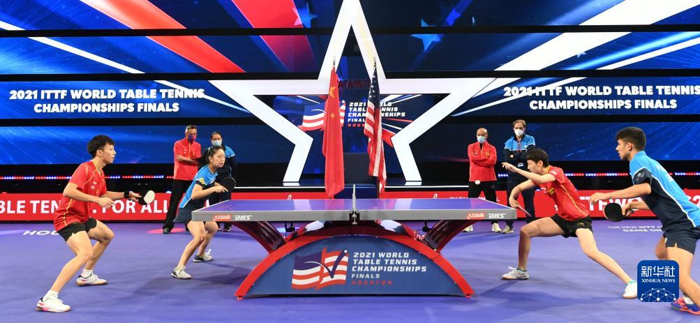 中美混双组合林高远(前左一)/张安(前左二)、卡纳克(前右一)/王曼昱(前右二)在2021年休斯敦世乒赛合练中(2021年11月22日摄)。在2021年11月下旬举行的世界乒乓球锦标赛上,中美选手联合组队出战混合双打比赛,纪念中美“乒乓外交”50周年。 新华社记者 吴晓凌 摄