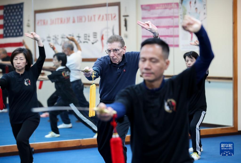在美国纽约的思坦太极武术中心,学员在老师带领下练习太极剑(2019年11月20日摄)。 新华社记者 王迎 摄