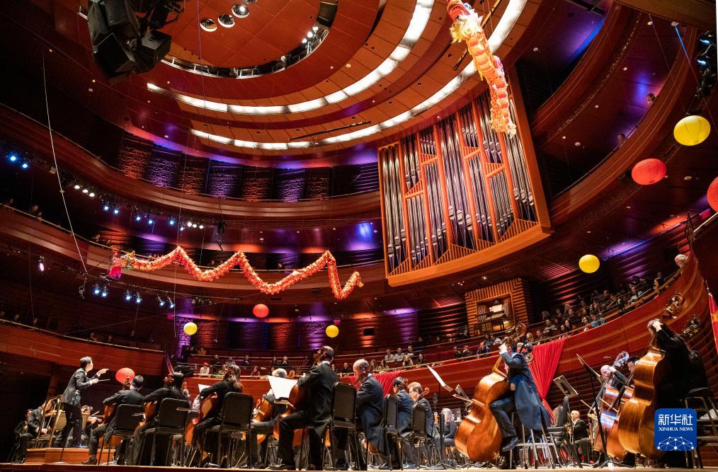 在美国费城,上海爱乐乐团与费城交响乐团的演奏家们在首届中国新年音乐会上携手演出(2019年1月29日摄)。 新华社记者 王迎 摄