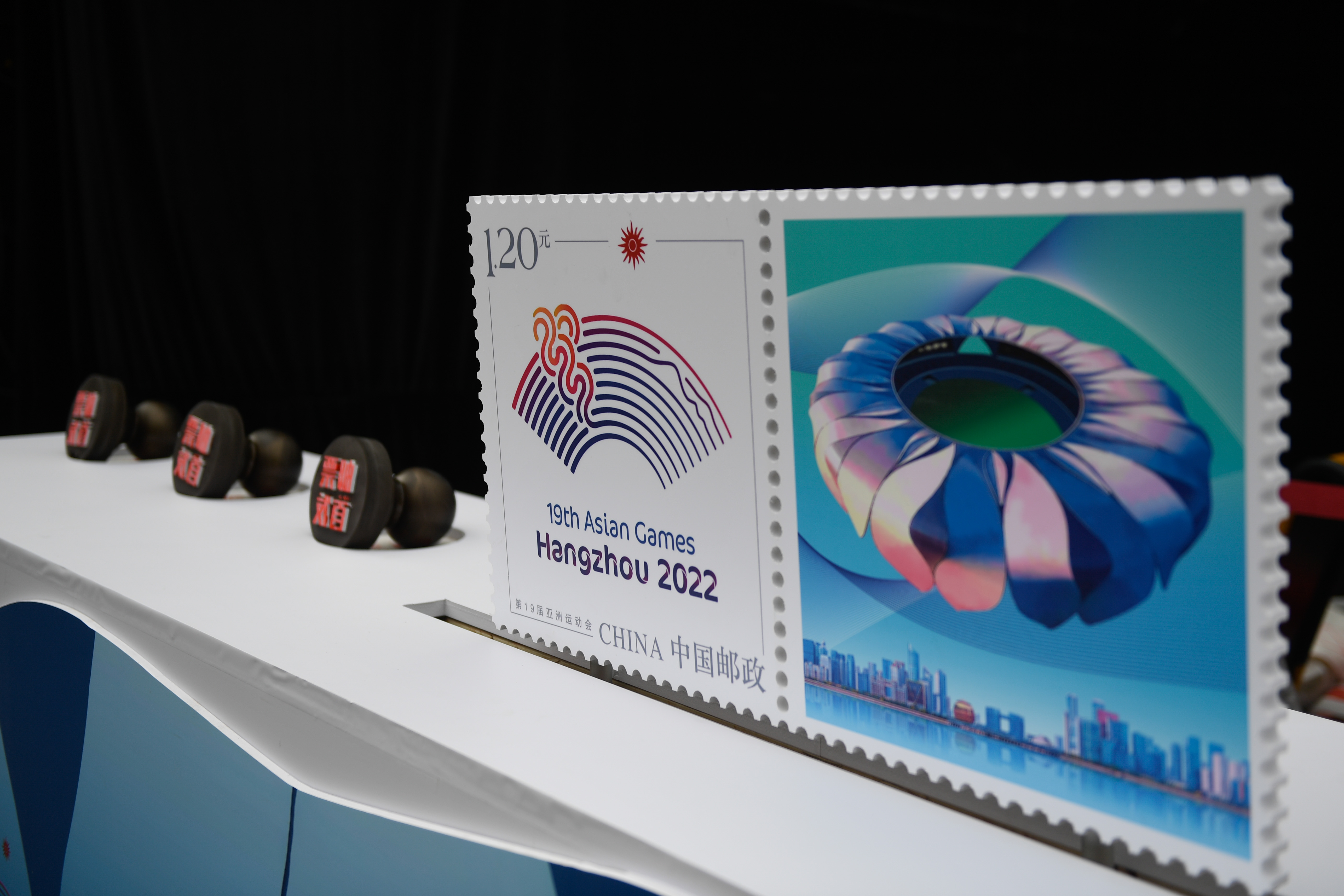 2019年5月18日,杭州亚运会首套个性化专用邮票的模型在西湖景区展示。新华社记者 黄宗治 摄