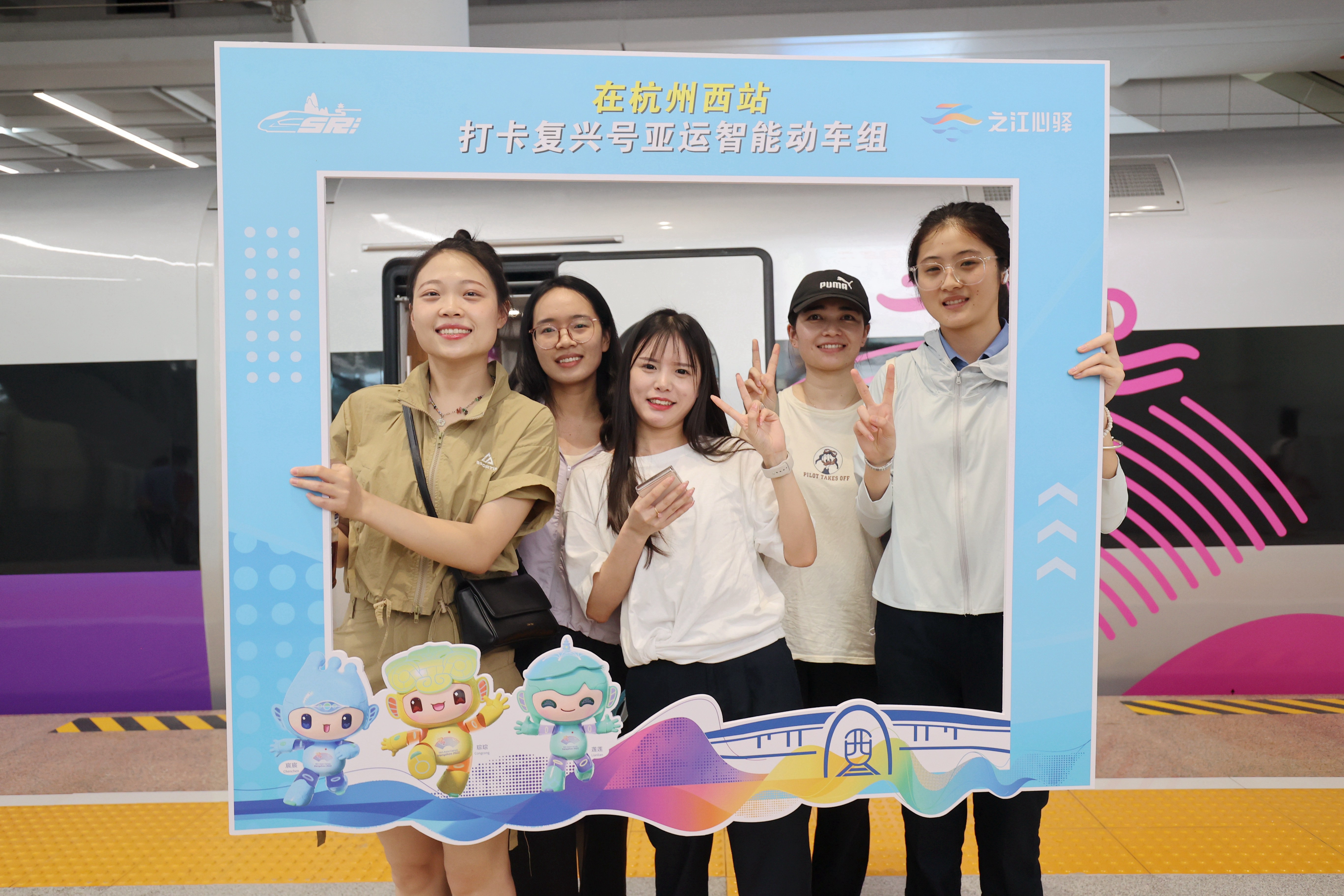 8月4日,在杭州西站,乘客在复兴号亚运智能动车组列车旁合影留念。新华社发(谢尚国摄)