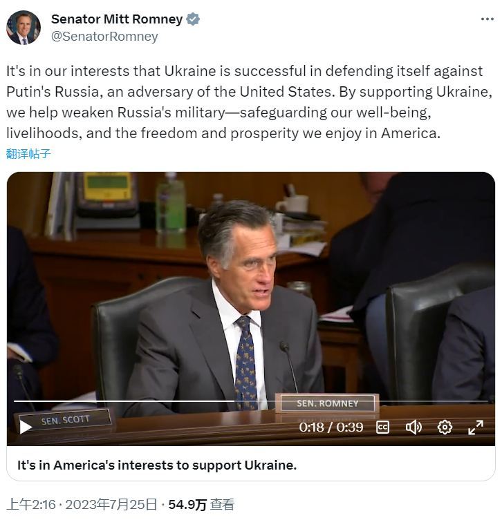 今年7月,罗姆尼又在社交媒体发文称,乌克兰能够成功抵御美国的对手俄罗斯,符合美国的利益。