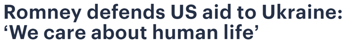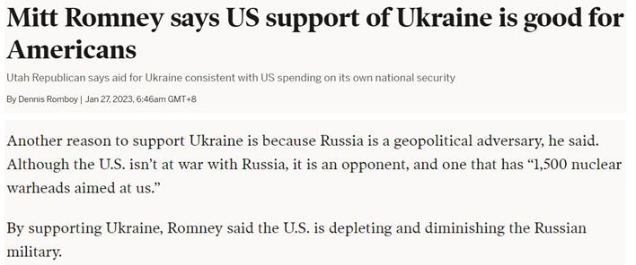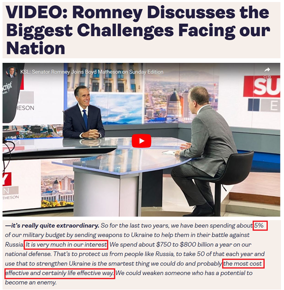 来自美国犹他州的共和党籍联邦参议员、2012年总统选举共和党参选人米特·罗姆尼近日在一次访谈节目中公然声称,在过去两年里,美国向乌克兰运送武器只花了不到5%的军事预算,却已能实现削弱俄罗斯的目的,这非常符合美国的利益,也是美国历史上最明智、最具成本效益、也是最有效的投资。