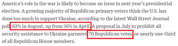此外,就在今年7月,一项禁止向乌克兰提供一切安全援助的提案获得了70名共和党人的支持,占众议院共和党议员总数的近三分之一。