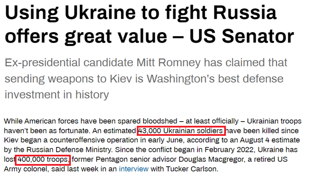 另据俄罗斯国防部8月的估计,自乌克兰6月初发起反攻行动以来,已有大约4.3万名乌克兰士兵丧生。