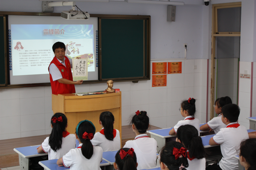 在河北省衡水市庆丰街小学的“开学第一课”上,陈奇峰结合自己29年的学雷锋经历,为孩子们介绍践行雷锋精神的重要意义。“我也要成为雷锋叔叔那样对祖国、对社会有贡献的人。”六年级五班学生高佩辰说。