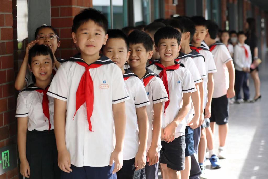 9月1日,上海市静安区教育学院附属学校的学生们在教室门口列队,准备前往开学典礼现场。新华社记者刘颖 摄